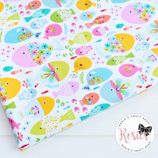 White Swimming With The Fishes -| Go Fish | Blend Cotton Fabric | Remnant 81cm x 110cm